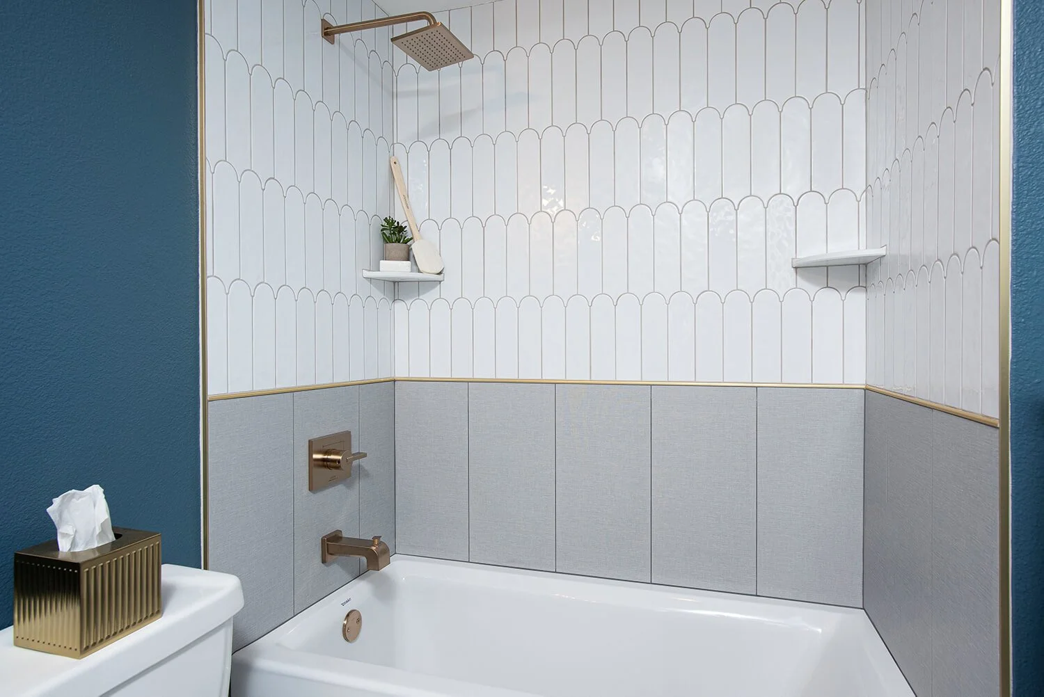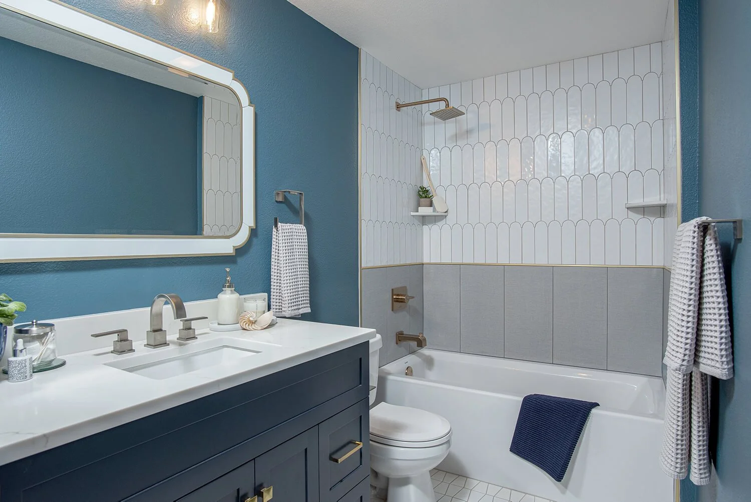 This condo renovation showcases a unique blend of bold style and imaginative design, tailored for a young client with a distinct taste. The project was an exciting creative challenge kicked off by her initial selections of a navy blue vanity and an art deco mirror that set the tone for the entire space.