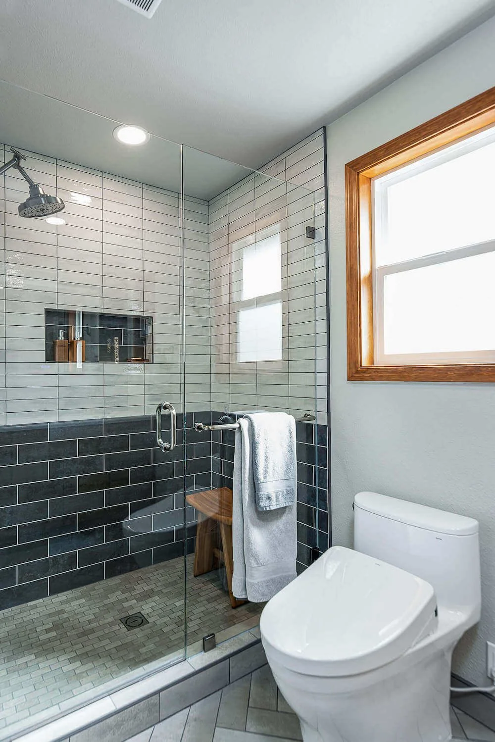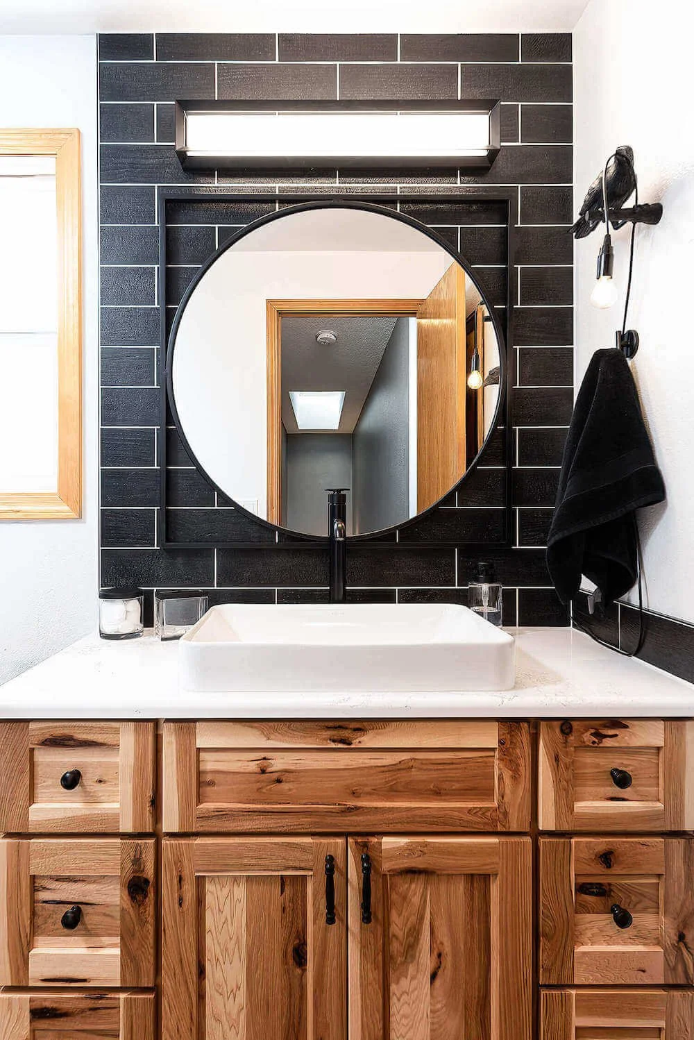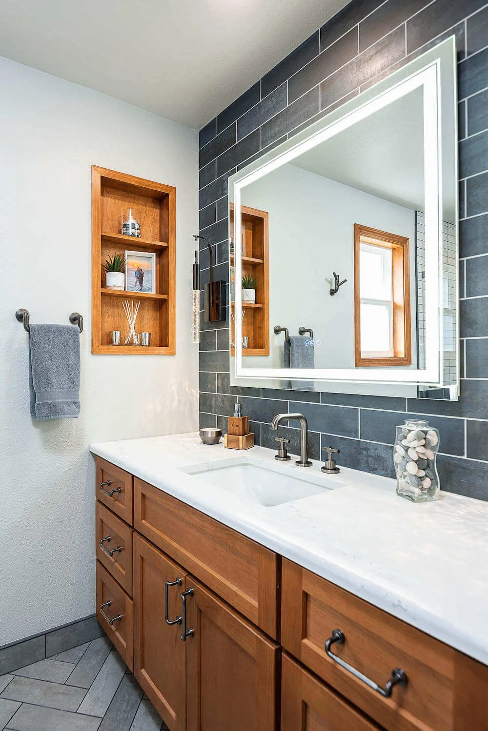 This entire interior home update was an exciting collaboration with a client who loves live music, collecting concert photos, camping, and entertaining. The renovation encompassed two full bathrooms and a half bath, the creation of a dedicated music lounge, a partial kitchen update, and general enhancements like new lighting and hardware throughout the house.
